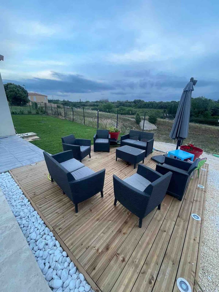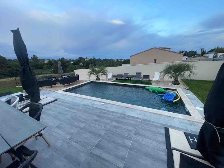 بيت من طابق واحد مع حمام سباحة خاص للراحة والاسترخاء