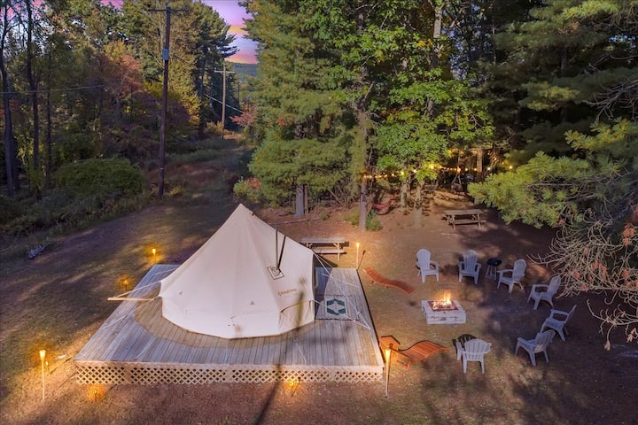 *كابينة حجرية داخلية حمام سباحة ساخن مع خيمة + حفرة نار