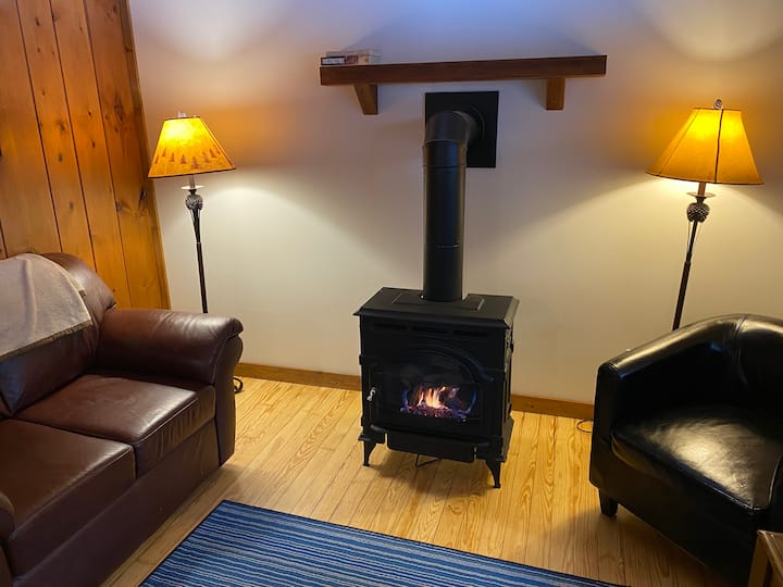 كوخ مريح مع شرفة علوية ومدفأة غاز