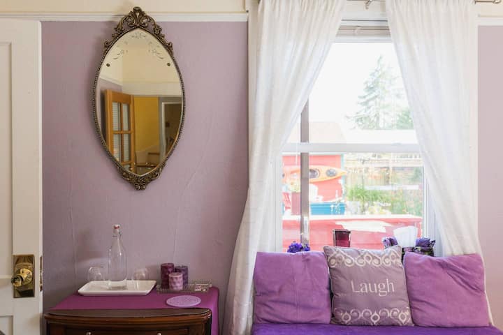 غرفة أرجوانية بإطلالة على حديقة مشمسة في قرية حضرية عصرية