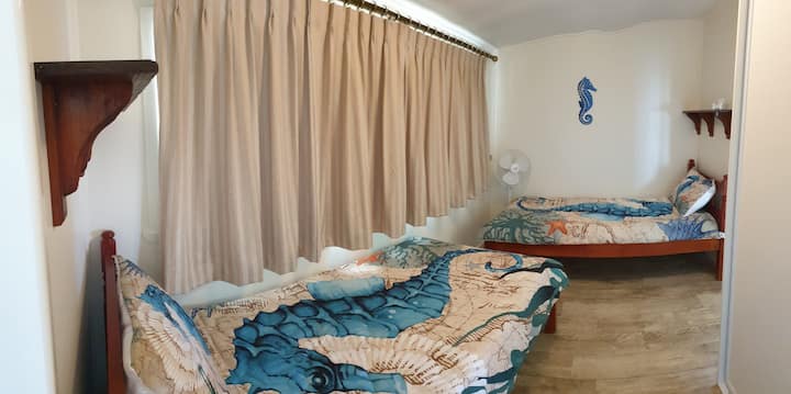كوخ شاطئ لطيف على بعد 300 متر من الشاطئ الخاضع للحراسة.