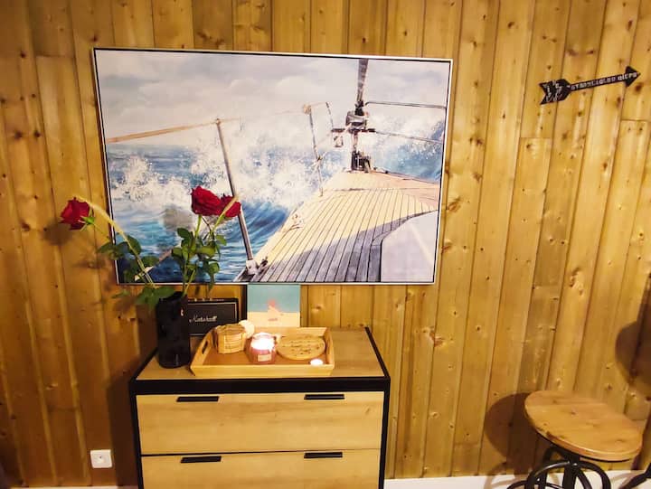 شاليه خشبي مع تراس قريب من الشاطئ -