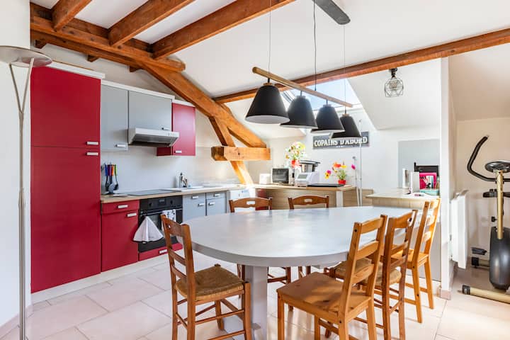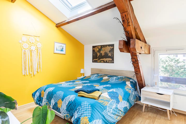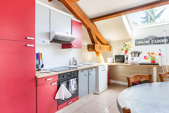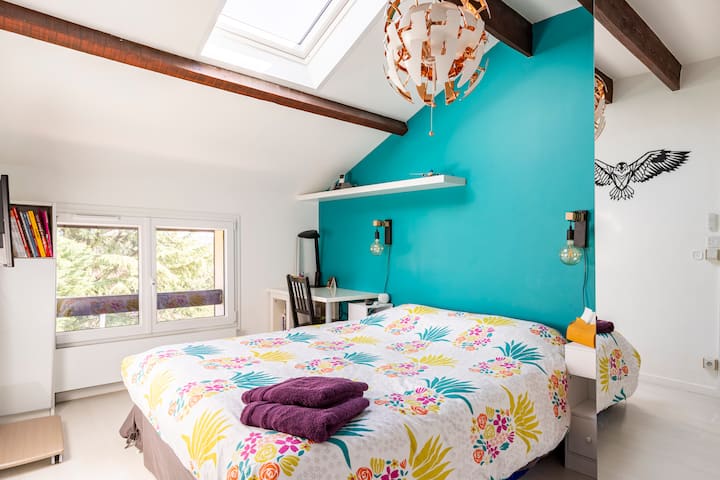 لدينا عائلة كبيرة مختلطة وبالتالي منزل كبير. كان هذا البيت يتكون من شقتين متصلتين بدرج داخلي. باب يقفل مساحة الطابق السفلي إذا أردت. عندما لا يكون المراهقون هناك، فإننا نستأجر طابقهم الذي يحتوي على جميع وسائل الراحة في الشقة مع مزايا المنزل: حديقة كبيرة وهادئة.