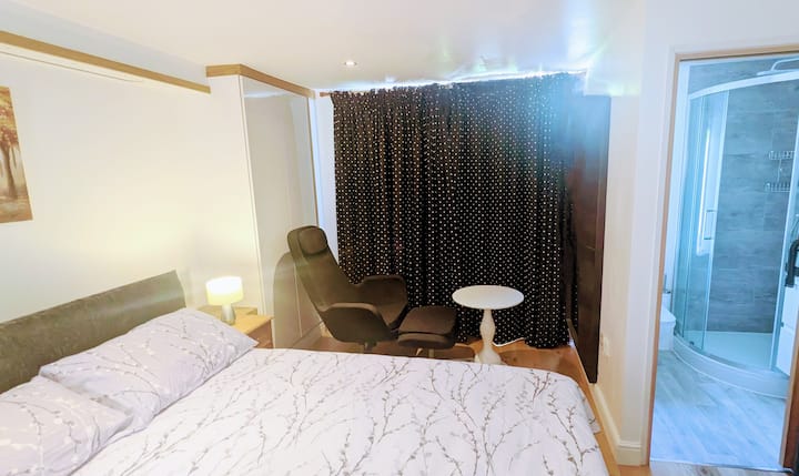 غرفة نوم مزدوجة في ستامفورد مع مدخل خاص