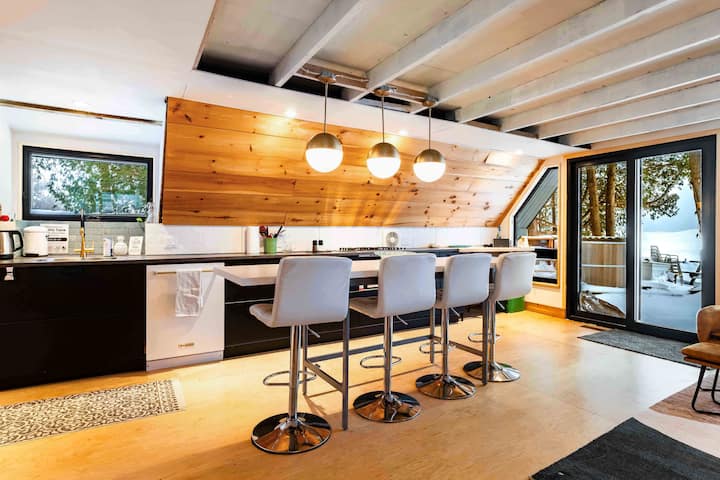 غروب الشمس في بحيرة هورون في بيت على شكل مثلث | حوض استحمام ساخن من خشب الأرز