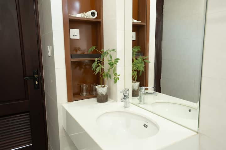 - ميزات الحمام الكاملة: المناشف، فرشاة الأسنان، معجون الأسنان، المشط، المجفف، براعم القطن...
