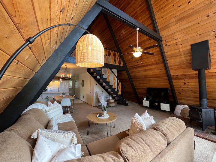 بيت على شكل مثلث مريح مع سطح كبير وموقد نار خارجي
