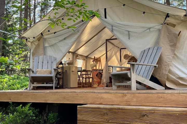مع إمكانية الوصول إلى المناطق العامة للمراحيض والاستحمام. أجواء التخييم المثالية. إنهم أقرب إلى الناس، ويعودون إلى المخيم المطل على الغابة.