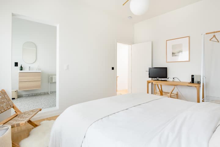 قمنا بتجديد منزلنا في الخمسينيات ومشاركته مع كلبنا الصغير تيرير ثيو، الذي يسره دائمًا مقابلة أشخاص لطيفين جدد.