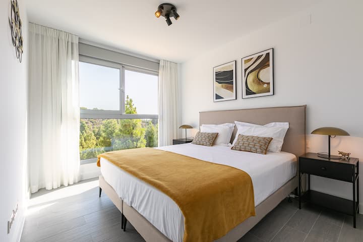 شقة أنيقة محاطة بالطبيعة مع إطلالات على حمام السباحة