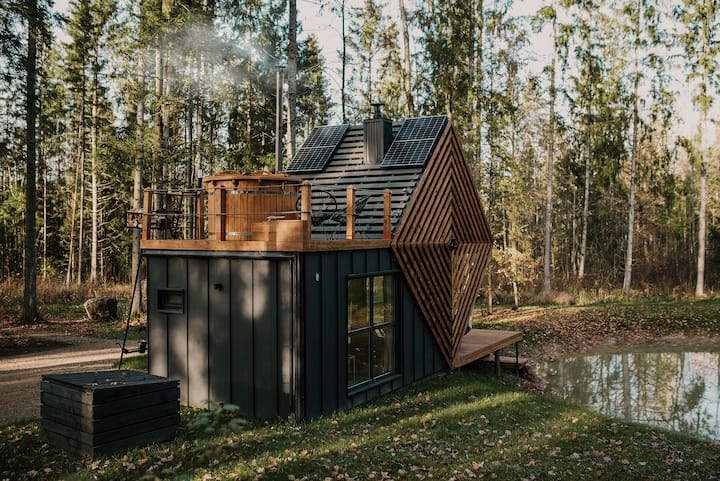 كوخ حديث خارج الشبكة في الغابة + أنبوب ساخن