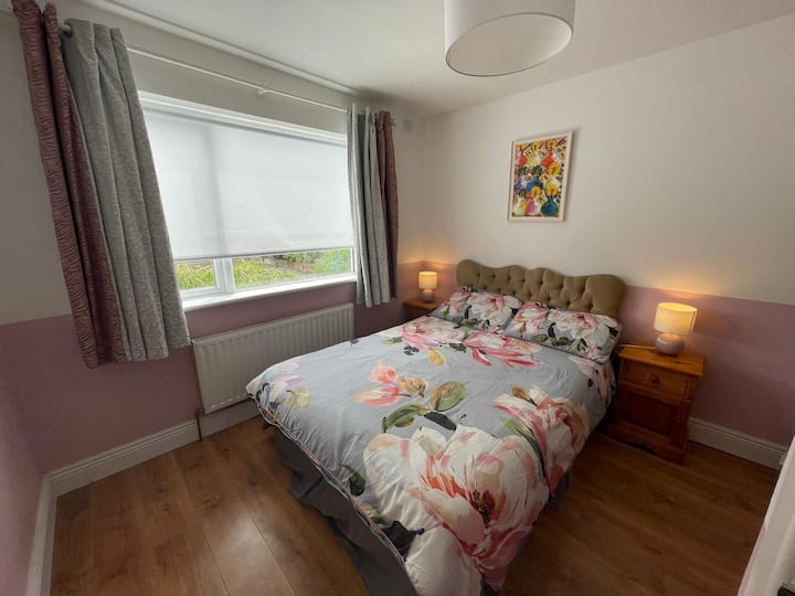 غرفة نوم مزدوجة في بيت هادئ، مع موقف سيارات وإفطار