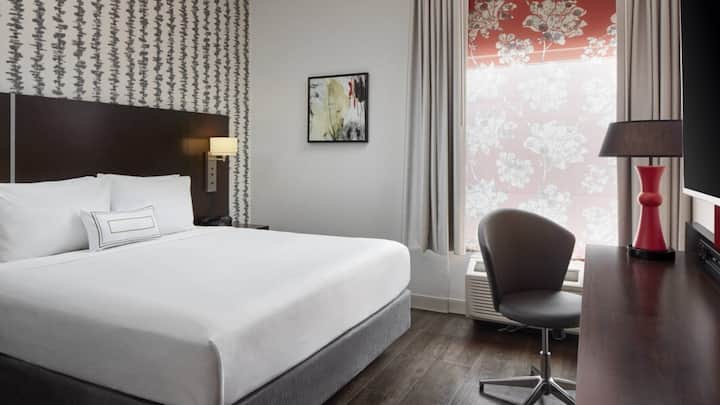تُعد هذه الغرفة مثالية للمجموعات أو العائلات، وتوفر لك سريرين فاخرين بحجم كوين مع مراتب مريحة وأغطية لحاف لنوم رائع في الليل. ابقَ على اتصال من خلال شبكة واي فاي مجانية، أو شاهد عروضك المفضلة مع قنوات متميزة، أو أنجز عملك على المكتب المريح. تجعل الثلاجة الصغيرة وماكينة القهوة ومستلزمات الحمام من هذا المكان منزلك في وسط مدينة واشنطن بين استكشاف أكبر المعالم السياحية في المدينة.