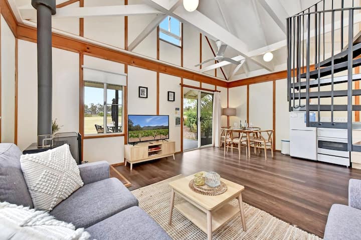 تؤدي أسقف الكاتدرائية إلى غرفة النوم العلوية في الجزء العلوي من الدرج الحلزوني لقضاء عطلتك الرومانسية. غرفة النوم في الطابق السفلي المزودة ببياضات نظيفة على سرير بحجم كوين تسمح بسهولة الوصول. حوض استحمام سبا نفاث لشخصين. استمتع بنزهة في الكروم أو شاهد حيوانات الكنغر التي تقضم العشب عند الغسق.