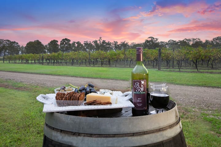فيلا رومانسية بغرفتي نوم في مزرعة عنب براكن ريدج تتميز بسقوف كاتدرائية وحمام سبا، وتتميز بموقع مثالي بين كروم العنب في هانتر فالي.