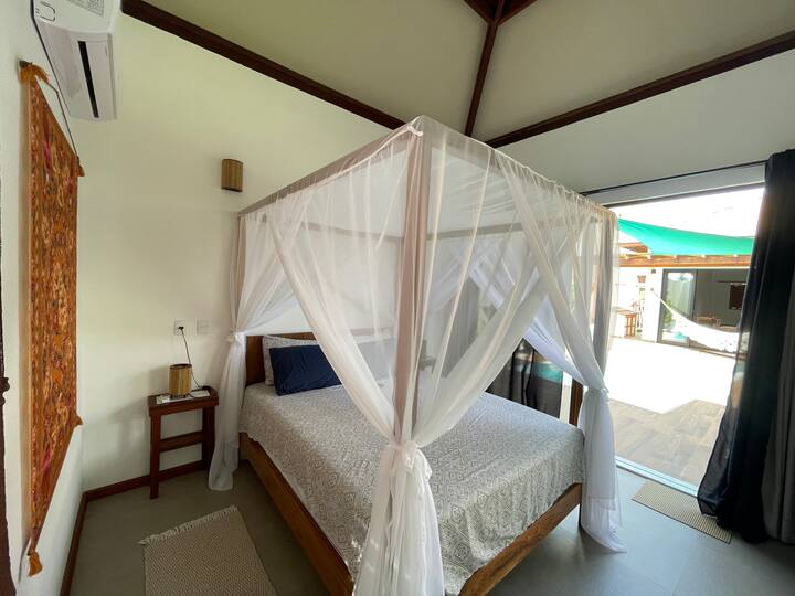 فرنسي يعيش في البرازيل لمدة 10 سنوات. بنيت بيتي أفكر في الترحيب بالعائلة والأصدقاء في مكان ساحر وهادئ. لهذا السبب صممت المشروع مع جناحين مستقلين تمامًا عن البيت الرئيسي، حتى يشعر الناس بالراحة.