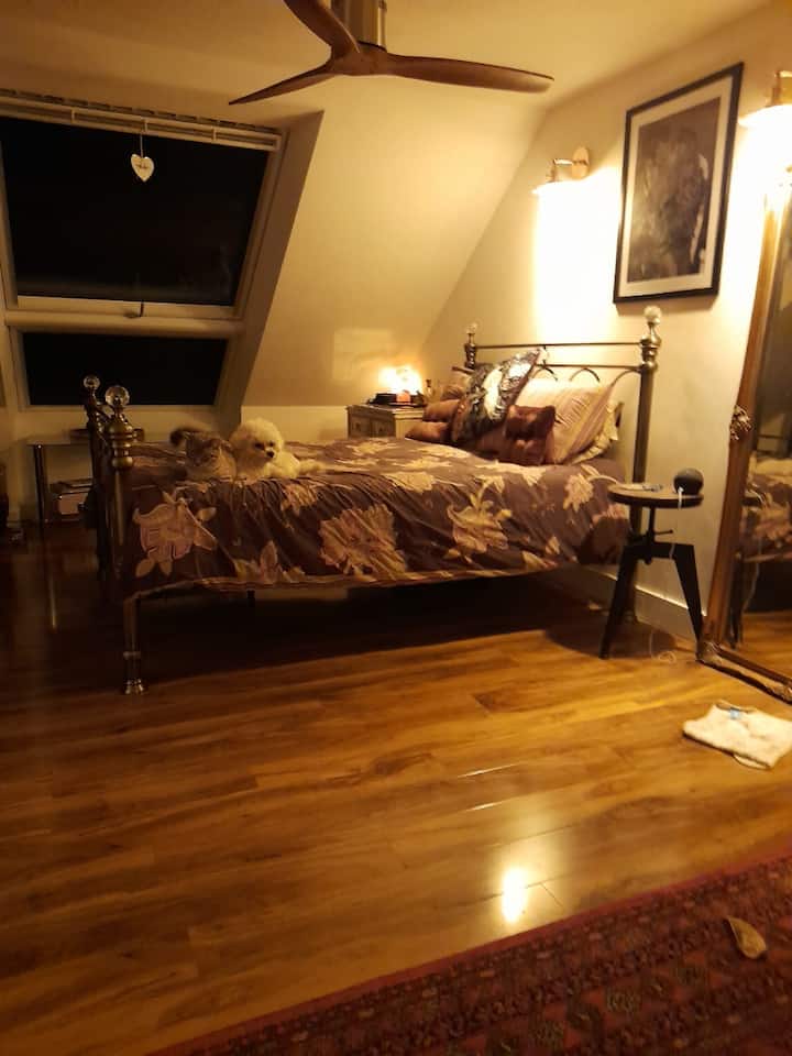 غرفة مزدوجة خاصة كبيرة في بيت عائلي سعيد.