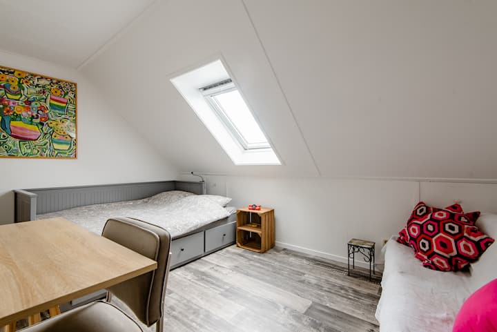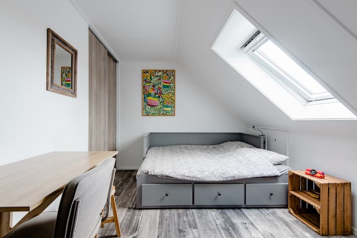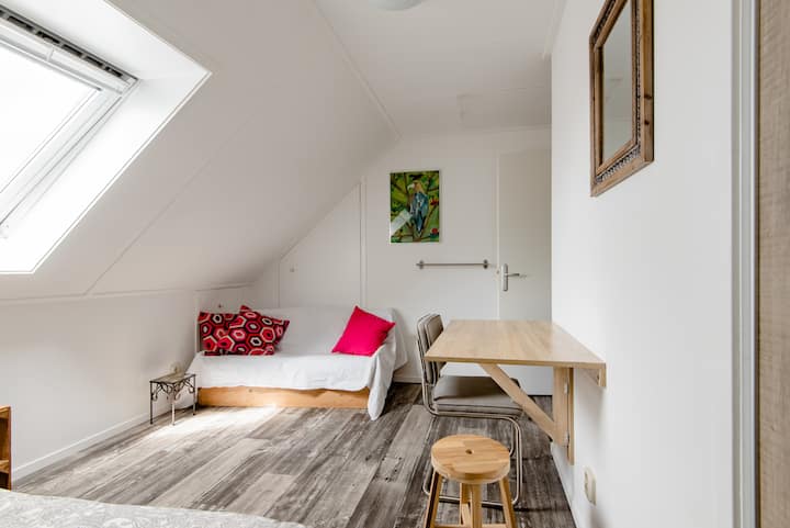 غرفة علوية واسعة في منزلنا المريح (وسط المدينة)