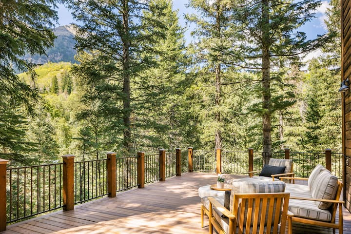 5 غرف نوم، إطلالة على الجبل، أصوات تيار، سطح كبير، حوض استحمام ساخن، كوخ صندانس كلاسيكي