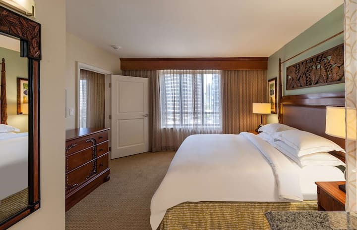 يوفر جناح بلس المكون من غرفتي نوم للعائلات ملاذًا واسعًا وأنيقًا، مع غرفتي نوم كبيرتين، ومناطق منفصلة للمعيشة وتناول الطعام، ومطبخ كامل – مثالي للعشاء العائلي أو وجبة سريعة قبل الذهاب إلى الشاطئ. يحتوي كل جناح على سرير كينج في الغرفة الرئيسية، وسريرين مزدوجين أو سرير كينج واحد في غرفة النوم الثانية، وأريكة نوم في غرفة المعيشة، تستوعب ما يصل إلى ثمانية ضيوف. ابدأ يومك بإطلالات خلابة على المحيط من شرفتك الخاصة أو استرخ مع ليلة فيلم على أجهزة التلفزيون ذات الشاشة المسطحة. مع الميزات الحديثة مثل واي فاي مجاني وغسالة/مجفف وحوض استحمام مريح في الحمام الرئيسي، يضمن Grand Waikikian إقامة مريحة لا تنسى.