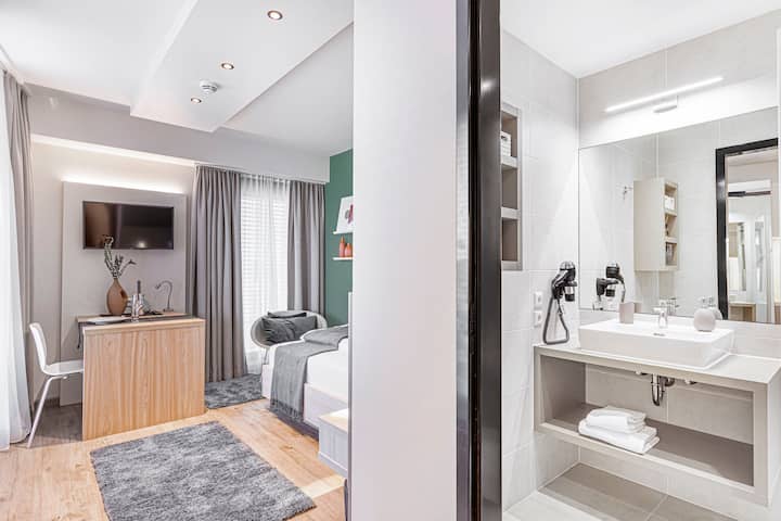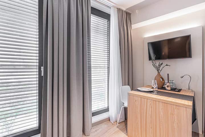 استوديو مفروش مريح مع صالة ألعاب رياضية