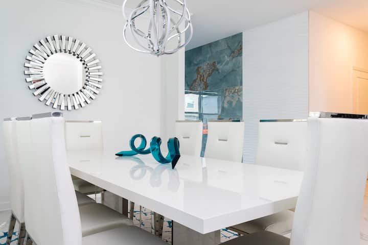 طاولة طعام إيطالية حصرية وديكور فيروزي متبلل وكراسي طعام جلدية بيضاء حصرية لراحتك. كل ذلك تحت ثريا حديثة.