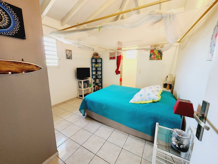 شكرًا لاهتمامك بكوخنا. نحب أن نقدم جزيرتنا الجميلة لضيوفنا وسنكون سعداء بمشاركة زوايانا السرية معكم... غوادلوب ليست مجرد شواطئ جميلة؛ إنها أيضًا شلالات وأعماق تحت الماء ومباني خارجية ورائحة ونكهات...