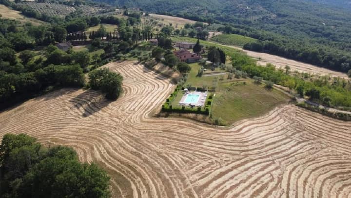 "ميت". بيت ريفي كامل محاط بالخضرة.