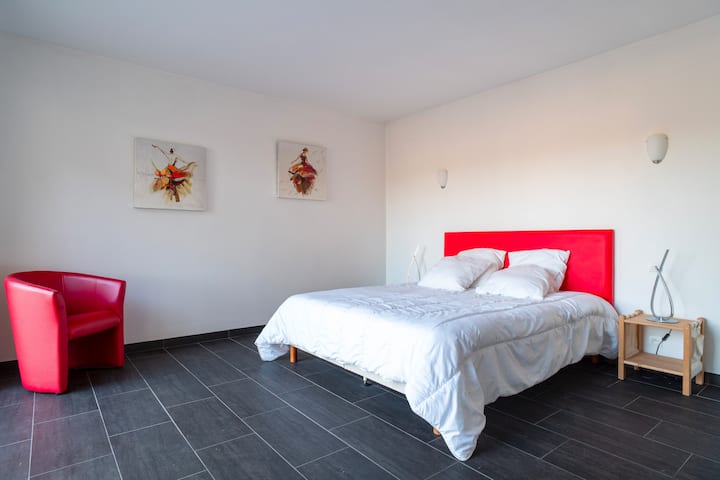 - غرفة النوم رقم رقم: جناح رئيسي مع سرير متوسط الحجم (160×200) وغرفة ملابس وغرفة استحمام مجاورة.