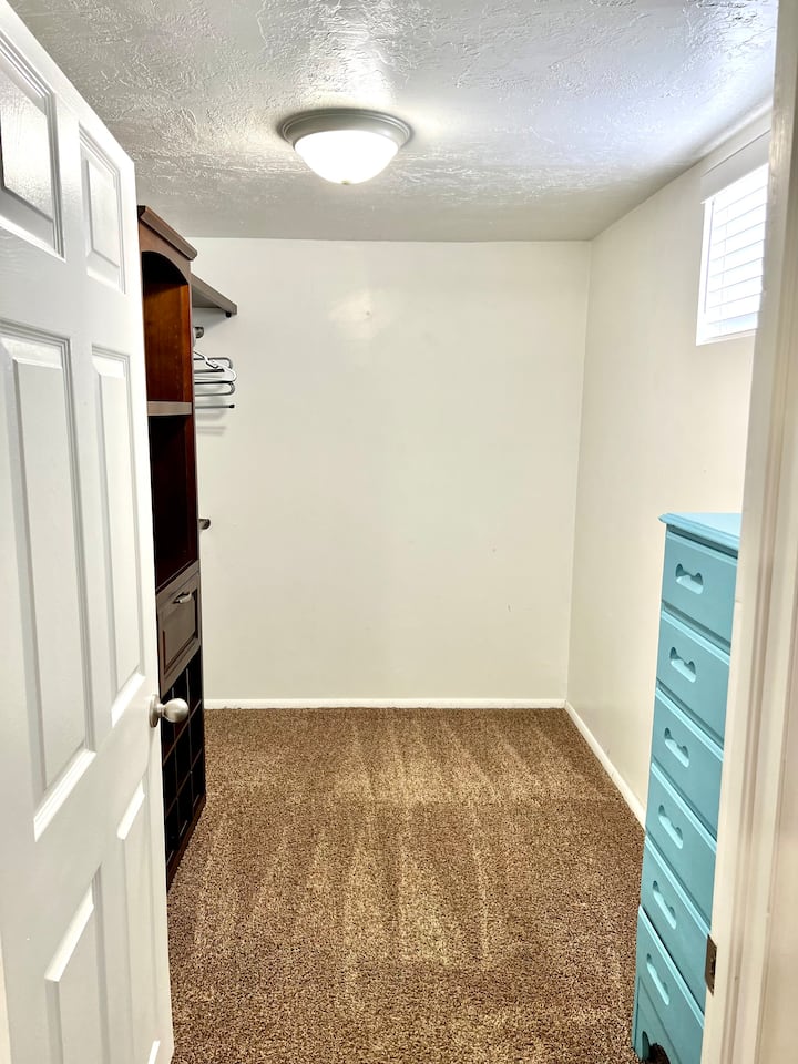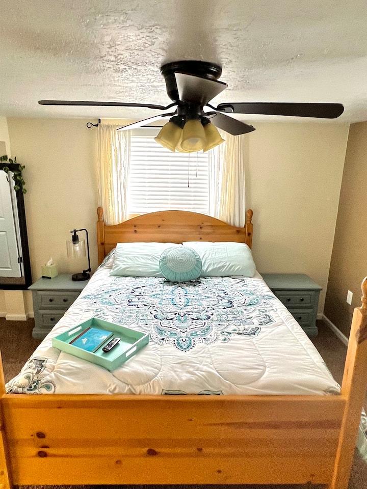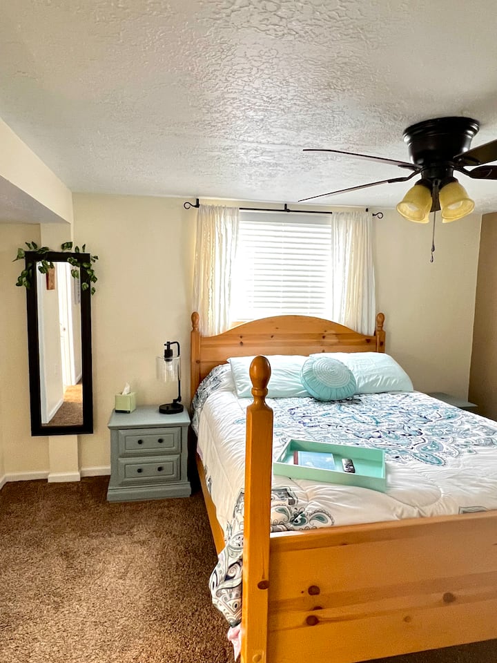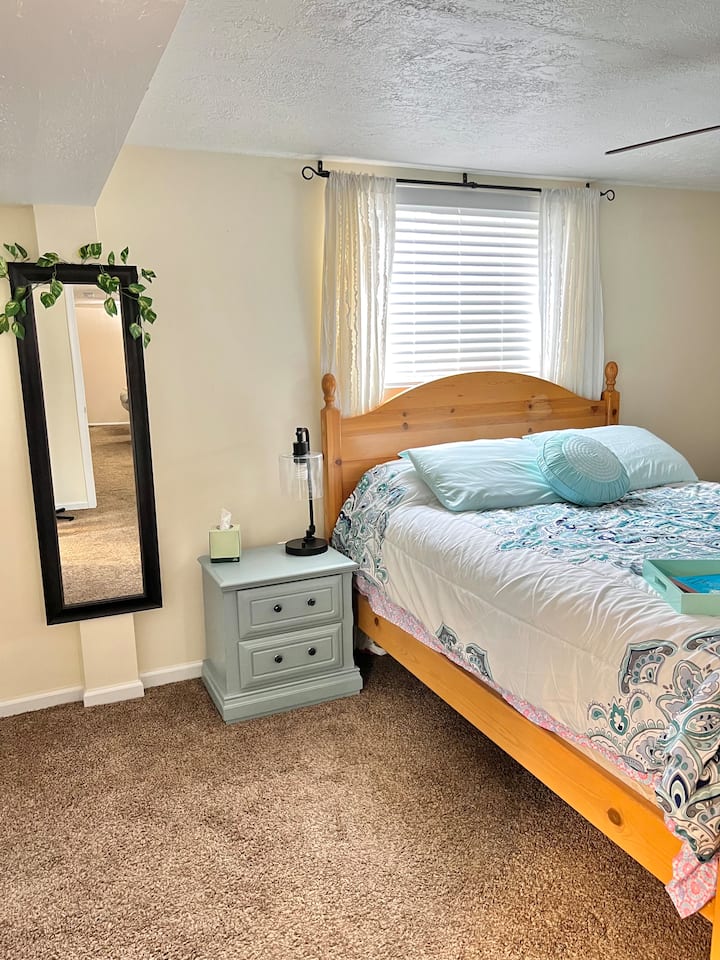 غرفة نوم مريحة في الطابق السفلي مع حوض استحمام بمضخات