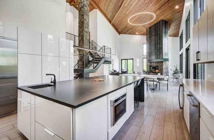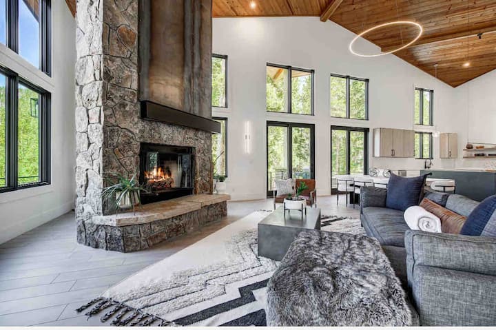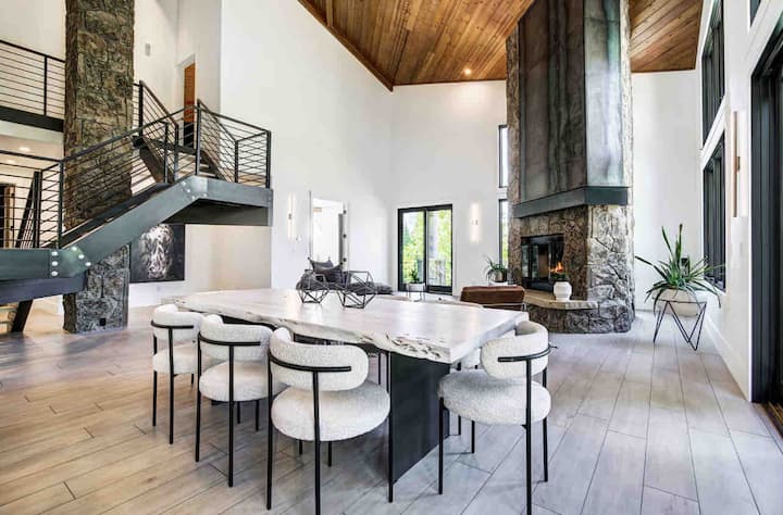 يتميز طابق المعيشة الرئيسي بأسقف عالية جدًا ومدفأة حجرية مذهلة ممتدة من الأرض إلى السقف وجدران من النوافذ تطل على مناظر جبلية شاسعة. يتناغم التصميم المفتوح بسلاسة بين غرفة المعيشة وغرفة الطعام ومطبخ الطاهي — وهو مثالي للتجمع بعد قضاء يوم في الجبل.
