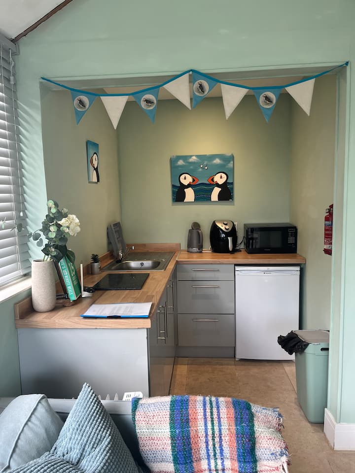 في الداخل، ستجد مساحة معيشة مشرقة ومريحة مع كل ما تحتاجه لإقامة قصيرة. يحتوي المطبخ الصغير على موقد كهربائي وميكروويف ومقلاة هوائية ومحمصة خبز وثلاجة وجميع أدوات الطهي الأساسية — وهو مثالي لإعداد وجبات بسيطة بعد يوم من المشي أو الاستكشاف.