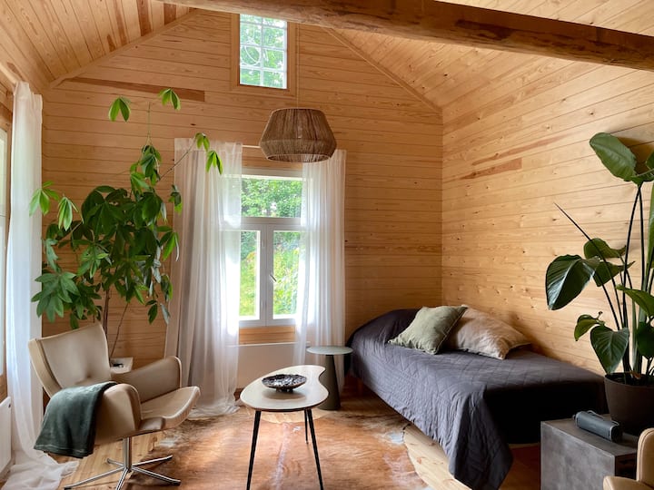 كوخ مع ساونا تعمل بالخشب ومكيف هواء