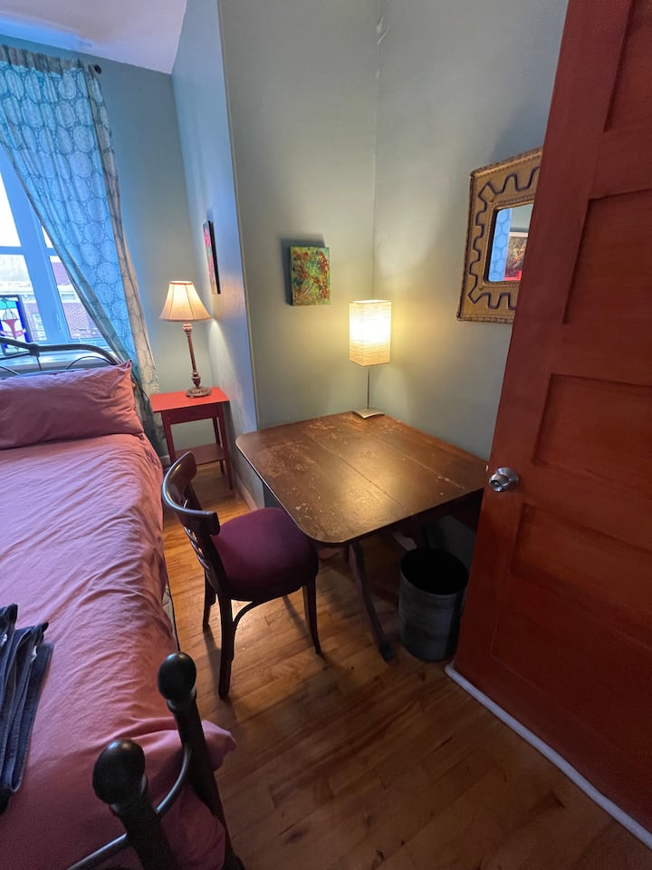 أنا، أليسون، هنا منذ عام 1997. نشأ أطفالي في المنزل وأنا أحب الحي وهذه المدينة بشدة. شريكي لوك هو موسيقي بدوام كامل (ساكس، ناي، إلخ) مع فرق موسيقية مثل Les Tireux d 'Roches، والعديد من الآخرين (موسيقى الجاز والفولك والبوب - بما في ذلك فرقة تحية فائقة). إنه إما يقوم بجولة أو هنا، يعمل في كوخ الموسيقى في فنائنا الخلفي، ويأخذ كلبنا كاش للمشي لمسافات طويلة. أنا موسيقي أيضًا (بشكل رئيسي العمل/التأليف الصوتي والكورالي) وأيضًا معالج نفسي ومستشار زوجين. أعمل في الغرفة الأمامية للشقة في الطابق السفلي ولهذا السبب من الأفضل الوصول إلي عن طريق الكتابة بدلاً من دق جرس الباب والمخاطرة بمقاطعة الجلسة.