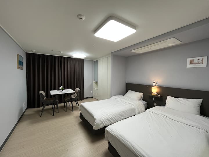 يوسو # سعر خاص جديد # موقف سيارات مجاني # إطلالة على المحيط # مبنى جديد # سريران مفردان