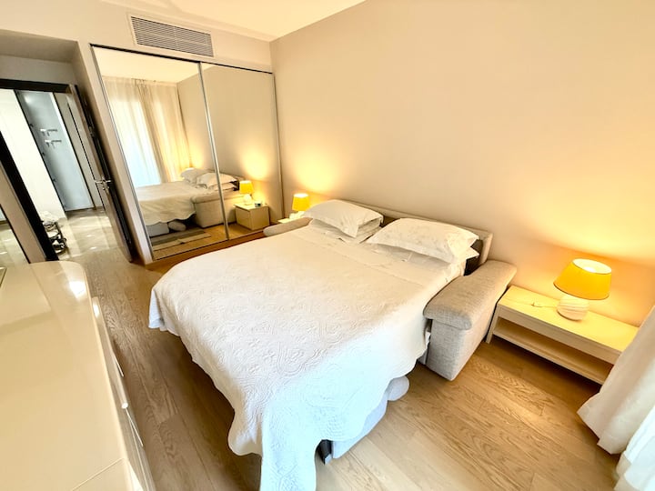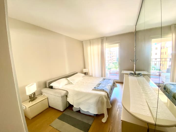 - غرفة نوم جميلة مع سرير مريح للغاية (مرتبة إسفنج ميموري فوم 17 سم) ونافذة باب كبيرة تواجه الشرفة. خزانة ملابس كبيرة مرآة وجدار مرآة، مع أثاث غني بالرفوف والرسومات، تسمح بتخزين الملابس الشخصية في العديد من المساحات المتاحة. هناك أيضًا مكتب مكان العمل.