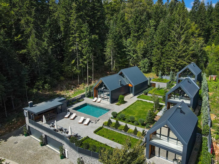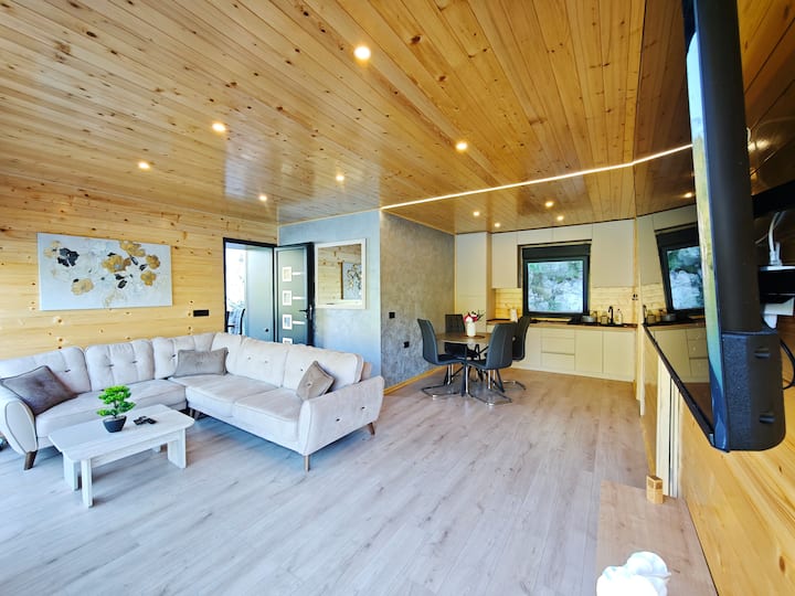 كوخ خشبي مريح وواسع مع غابة في الفناء