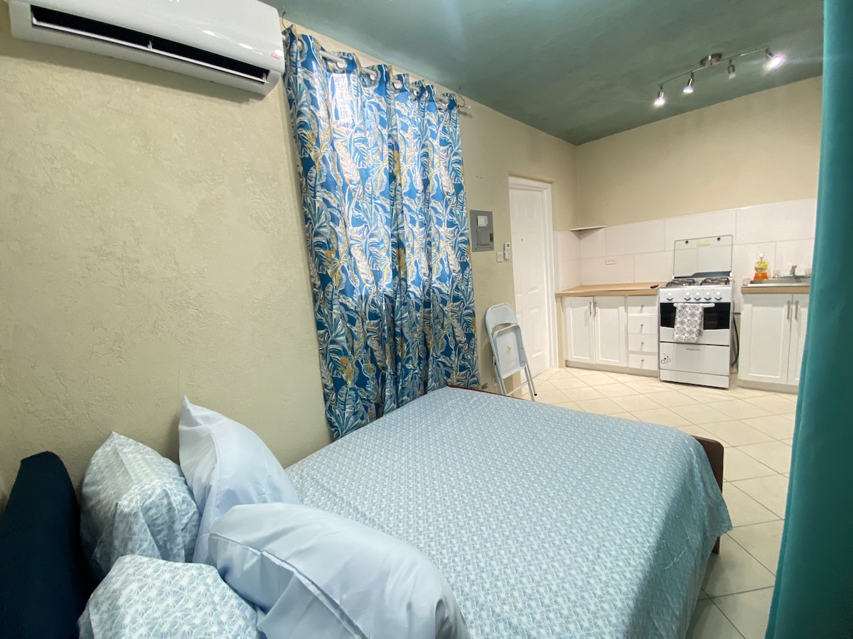 شقة استوديو مفروشة بالكامل مع سريرين تقع على بعد خمس (5) دقائق فقط من المطار. (مطار غرانتلي آدمز الدولي) (GAIA، BGI). رائعة للتوقف أو العطلات. على بعد 15 دقيقة من السفارة الأمريكية. على بعد عشر (10) دقائق من أوستينز فيش فراي، وبارات مختلفة، ومتجر بقالة بالإضافة إلى 6 دقائق من القرى في كوفرلي. ومجمع تسوق سيكس رودز. تبعد مدينة بريدجتاون (20) دقيقة بالسيارة عن هذه الشقة المريحة. استمتع بموقف للسيارات ومدخل خاص وواي فاي مجاني.