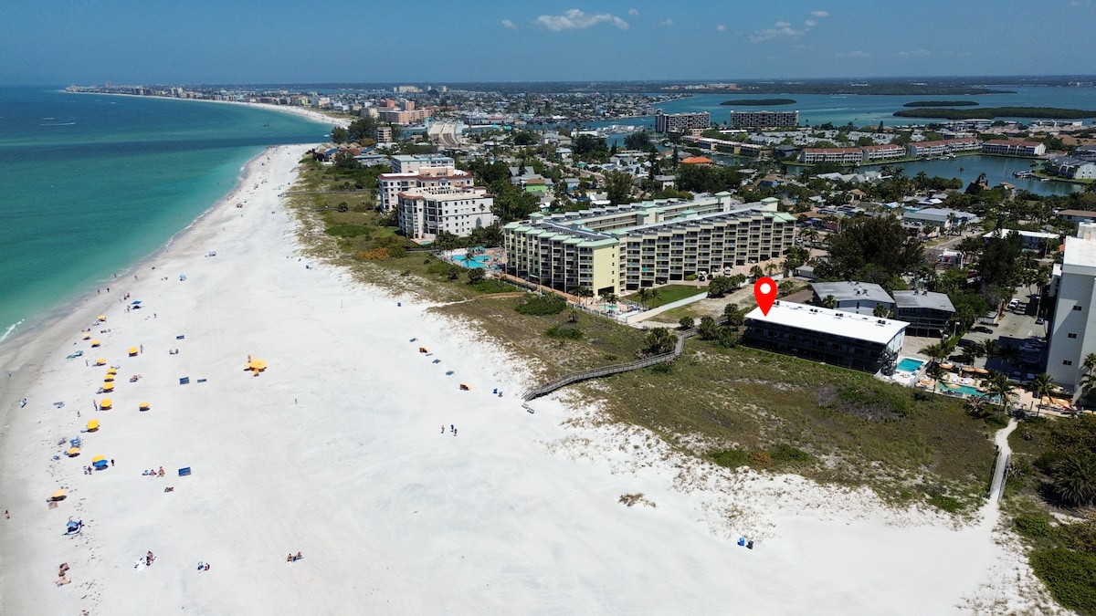 شقة جديدة تم تجديدها بالكامل على شاطئ البحر الخلاب على شاطئ خاص. مسافة سير على الأقدام إلى الحانات والمطاعم والموسيقى الحية والمزيد! سرير بحجم كينج جديد تمامًا، وواي فاي عالي السرعة، وأجهزة تلفزيون ذكية مع كابل/نتفليكس، وحمام سباحة ساخن، وباربيكيو/شوايات، وطاولات خارجية، ودش، وشرفة على شاطئ البحر، ومساحة عمل وأنت على الشاطئ مباشرة! على بعد مسافة قصيرة بالسيارة من مطاري تامبا/بيز، وسط مدينة سانت بيت، متحف دالي والمزيد! تم تجهيز الشقة بالكامل بكل ما تحتاجه ويديرها مضيف متميز لقضاء عطلة شاطئية مثالية!
